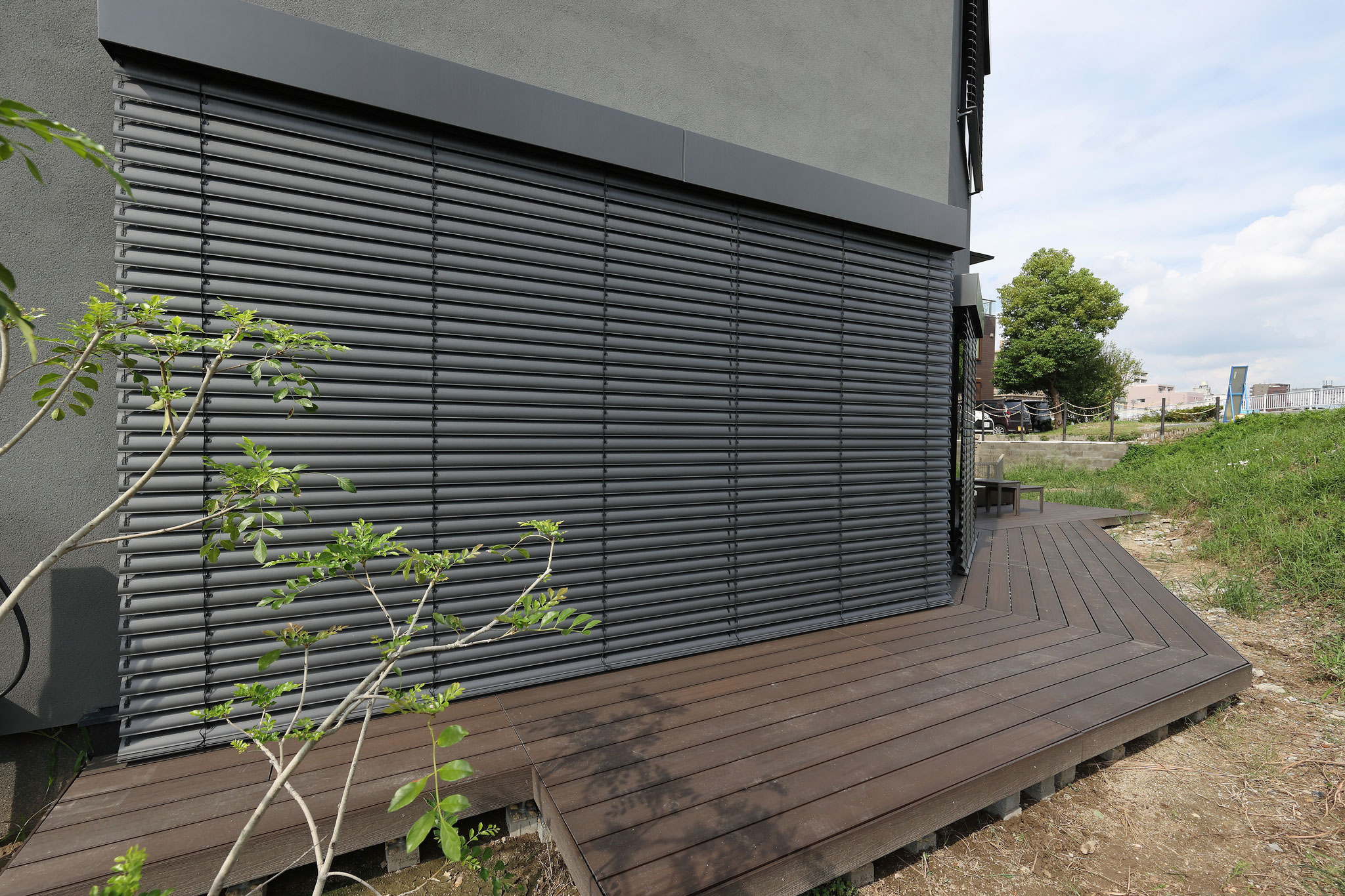 外付けのブラインドは、まだまだ日本において、見かける事が少ない設備だと思います。日射取得を調整する意味で、非常に有効で、昨今の異常気象とも言える夏の暑さに対して、絶大の効果を発揮します。弊社はパッシブハウスの建築ノウハウがあり、ノキを出し、日射取得をコントロールする事に関して、重要性の知見がありますが、昨今の気候では、冬の太陽光をコントロールするのが、ノキでは難しくなってきております。その点、外付けブラインドは、あらゆる気候条件においても柔軟に対応出来るため、非常に効果の高い結果をもたらします。また、目隠しの要素もあり、上手く活用することで、外の視線を遮断することもでき、カーテン替わりの役割も担うことが可能です。残念なのは、まだ日本において、スマホでの対応が遅れているため、詳細な制御が遅れています。弊社より、メーカーに改善の打診をしております。