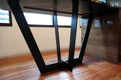 この脚部は、ミリ単位で設計された角度・厚み・接合部の精度により、重厚な天板をしっかりと支えながらも、視覚的には軽やかさを保つ構造。レーザーカットや精密溶接、焼付塗装などの高度な金属加工技術を駆使し、工業的でありながら彫刻的な佇まいを実現しています。