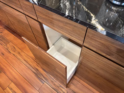 ・キャビネットに、ゴミ箱(ゴミ袋)を入れられる、キャスター付きの引き出し扉にしました。実際に使ってみると、45リットルのゴミ袋がすっぽり入り、使い勝手が非常に良いです。ショールームはこれを2つ作ってあるのですが、もう一つには、空き缶や、空き瓶をいれるスペースとして使っています。もう1つあっても良いかもしれません。そこは、使用者さんの生活スタイルと、物理的なキャビネットの大きさと優先度になりますので、しっかりと話しあって決めていく重要な要素の一つです。