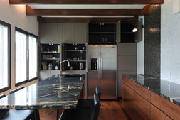 ・シンクの色は、ステンレスの色でも良いかなと思いましたが、完成してみると、統一感がでて、素晴らしい見た目になりました。黒色系の天板にするなら、シンクは黒がオススメですね。そもそも、黒になったエピソードとして、ドクターの意見として、いつも手術室でステンレスのシンクを見ているから、別の色があったら、気分もかわっていいなと、そんな話を小耳に挟んでいたので、そんなエピソードもあり、あまり無いシンクの色を変更するという事になりました。結果として大成功でした。自信をもってオススメできます。